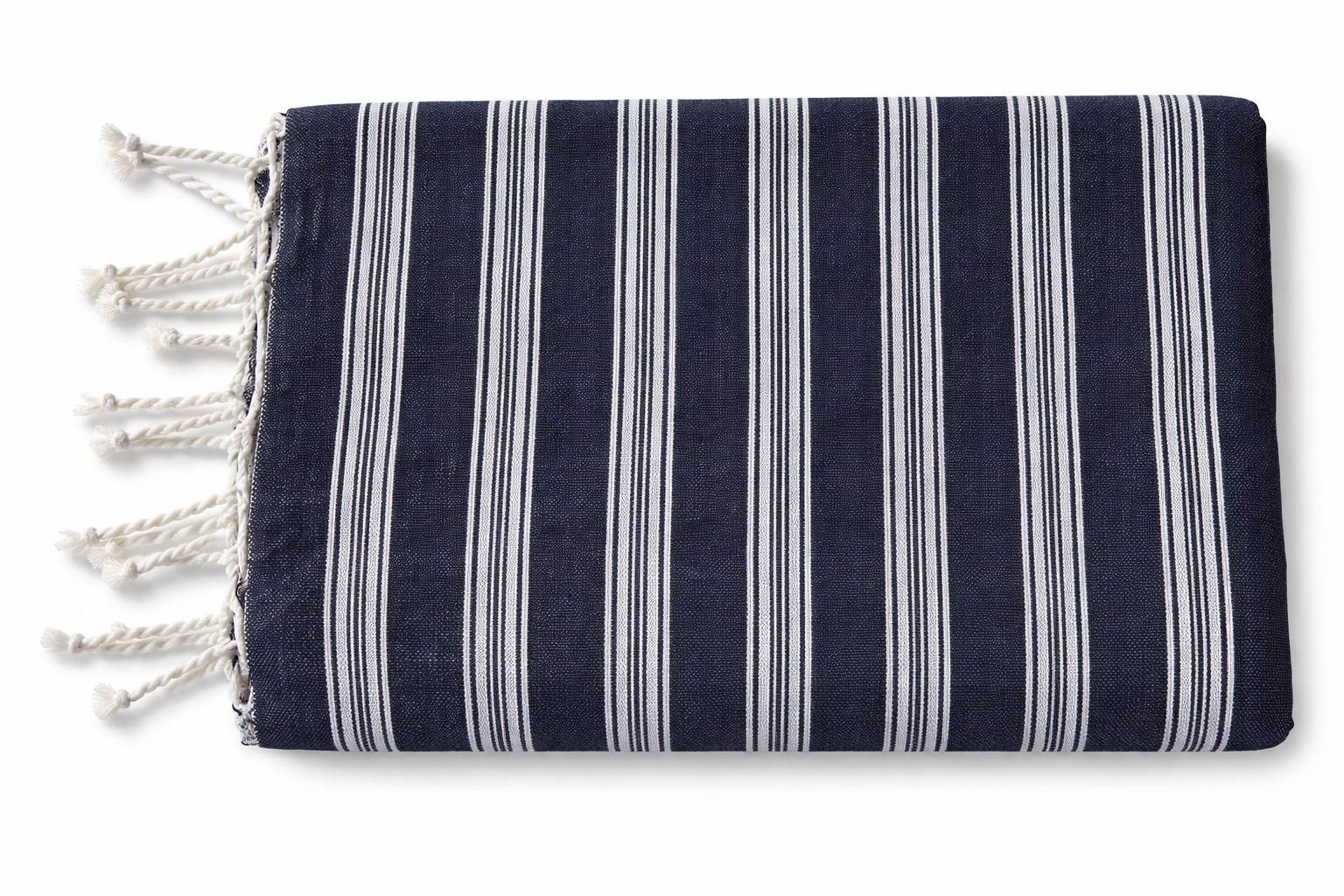 Cette fouta coton bleu marine combine tradition tunisienne et praticité moderne. Tissée en coton pur selon un savoir-faire artisanal, elle affiche une teinte bleu marine rehaussée de rayures blanches parallèles pour un style intemporel.