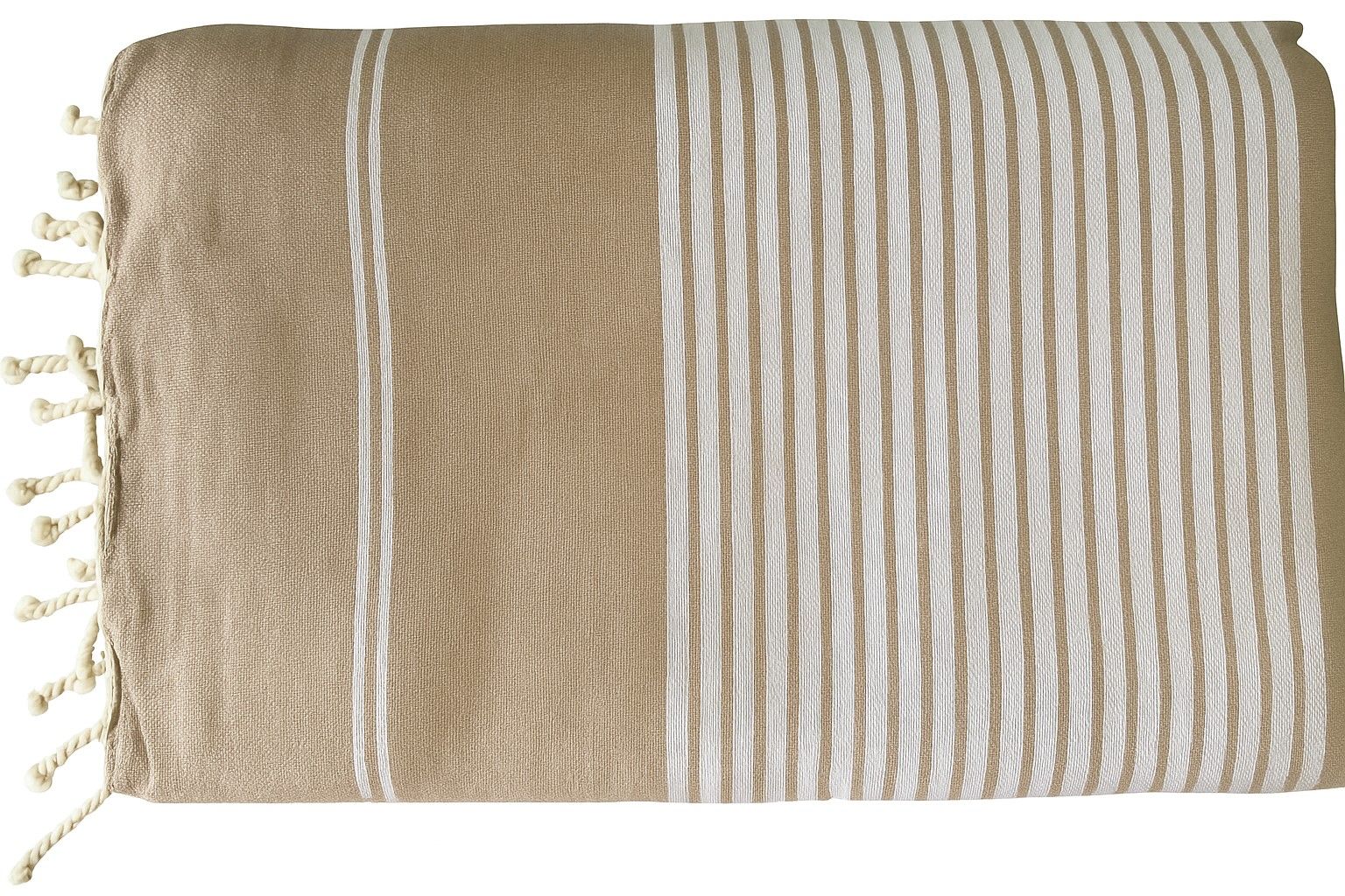 Cette fouta grande taille idéale pour la plage présente des dimensions remarquables de 200 cm x 300 cm, permettant une utilisation partagée ou une couverture optimale. Tissée selon la tradition tunisienne, elle associe la couleur beige au blanc dans un tissage plat 100% coton.
