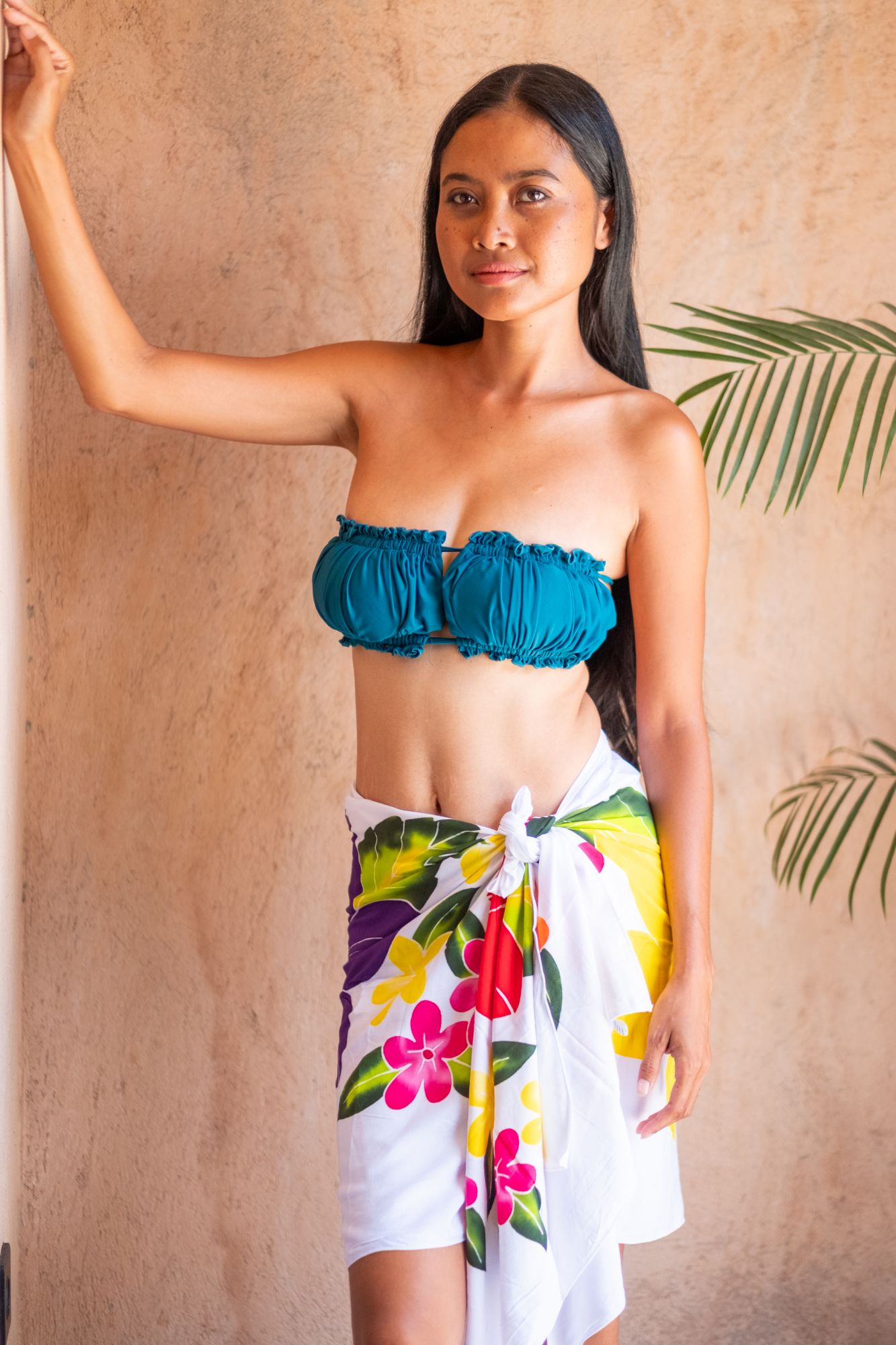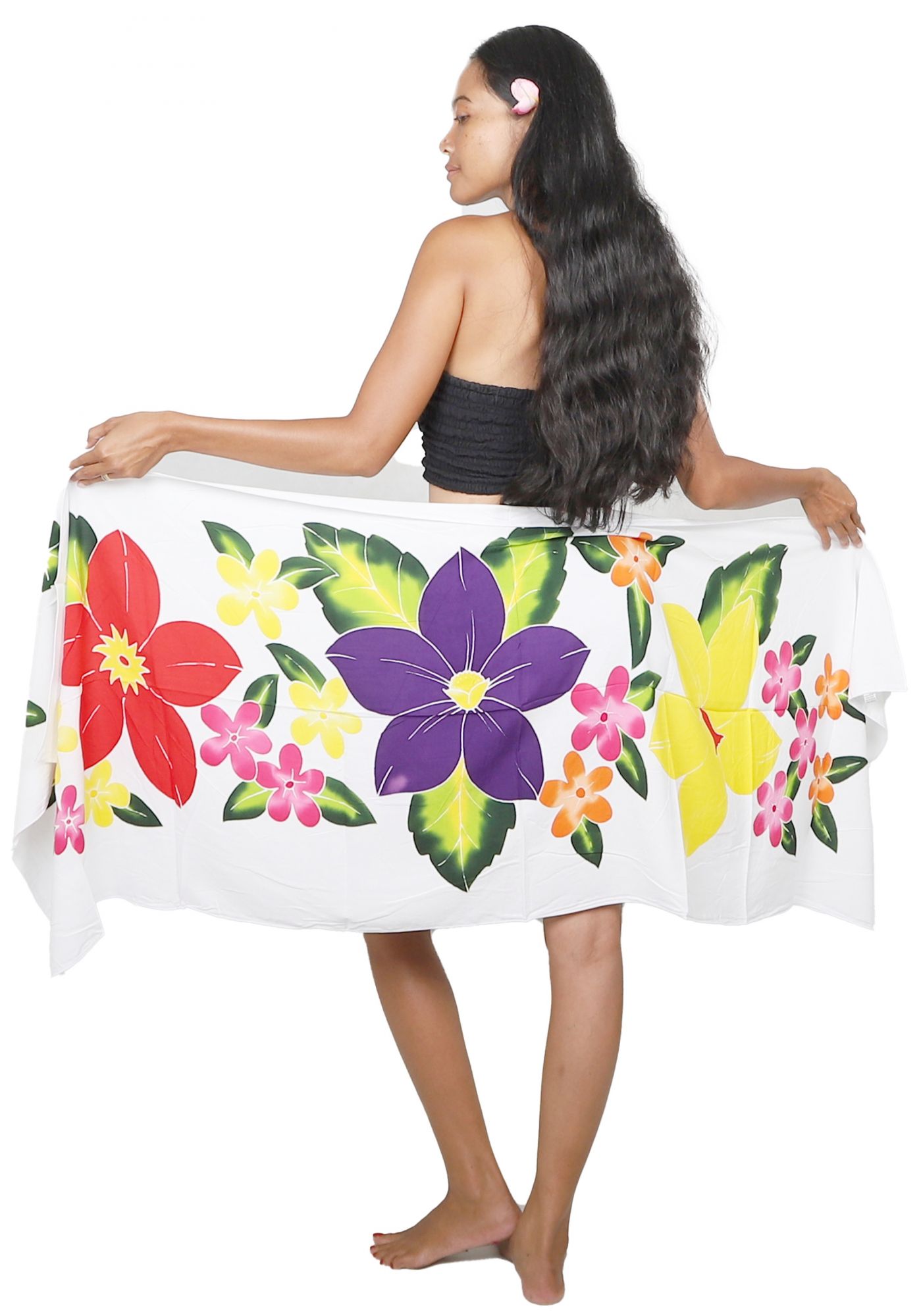 Découvrez le style élégant et pratique du mini paréo blanc pour la plage. Ce mini paréo, orné de magnifiques monettes colorées, offre un véritable écho aux paysages floraux de Tahiti.