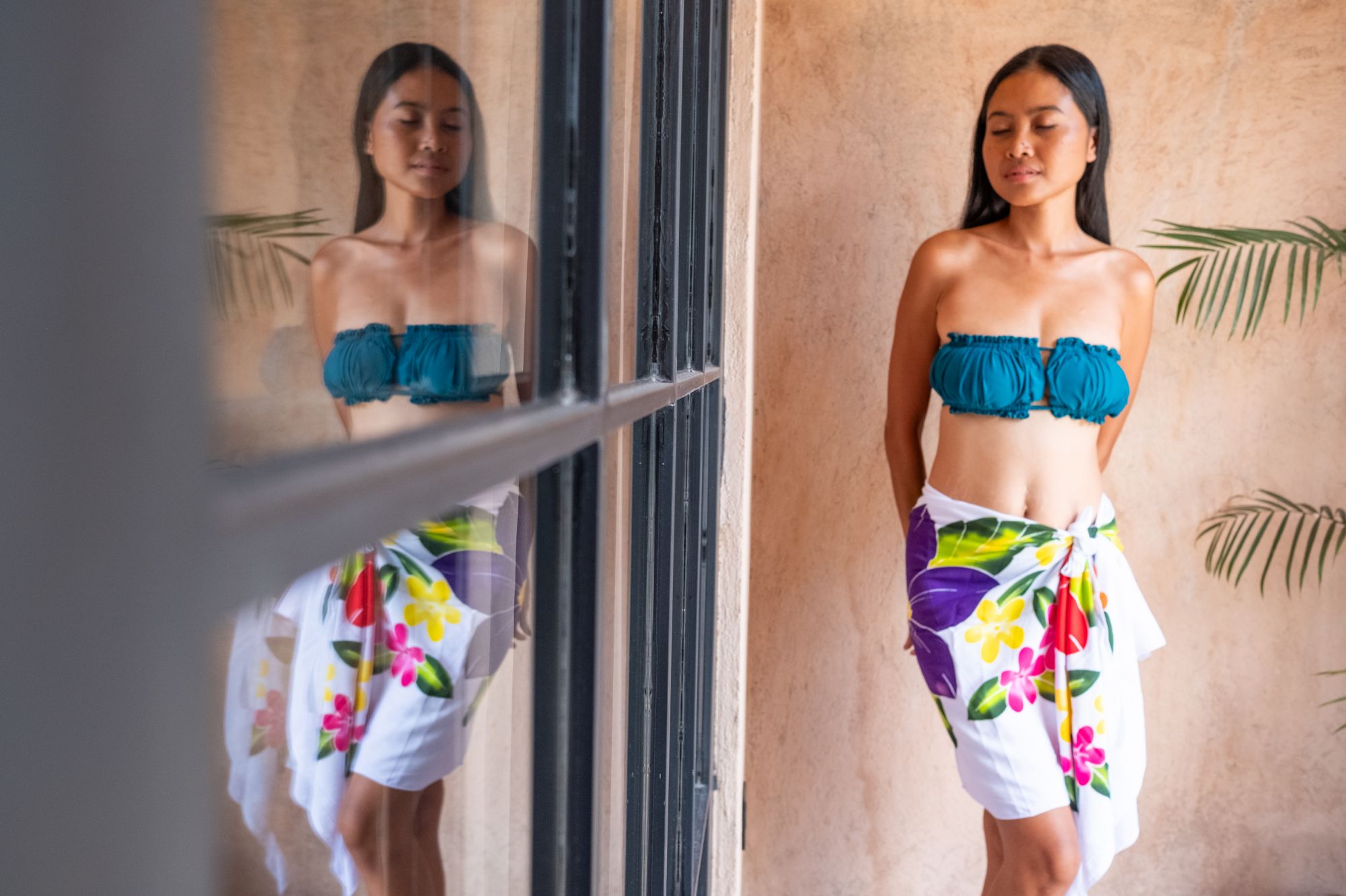 Ce paréo procure une véritable connexion avec l'artisanat local, un tissu qui paraît danser avec le vent, comme si chaque fleur avait été déposée par une brise venue des îles.