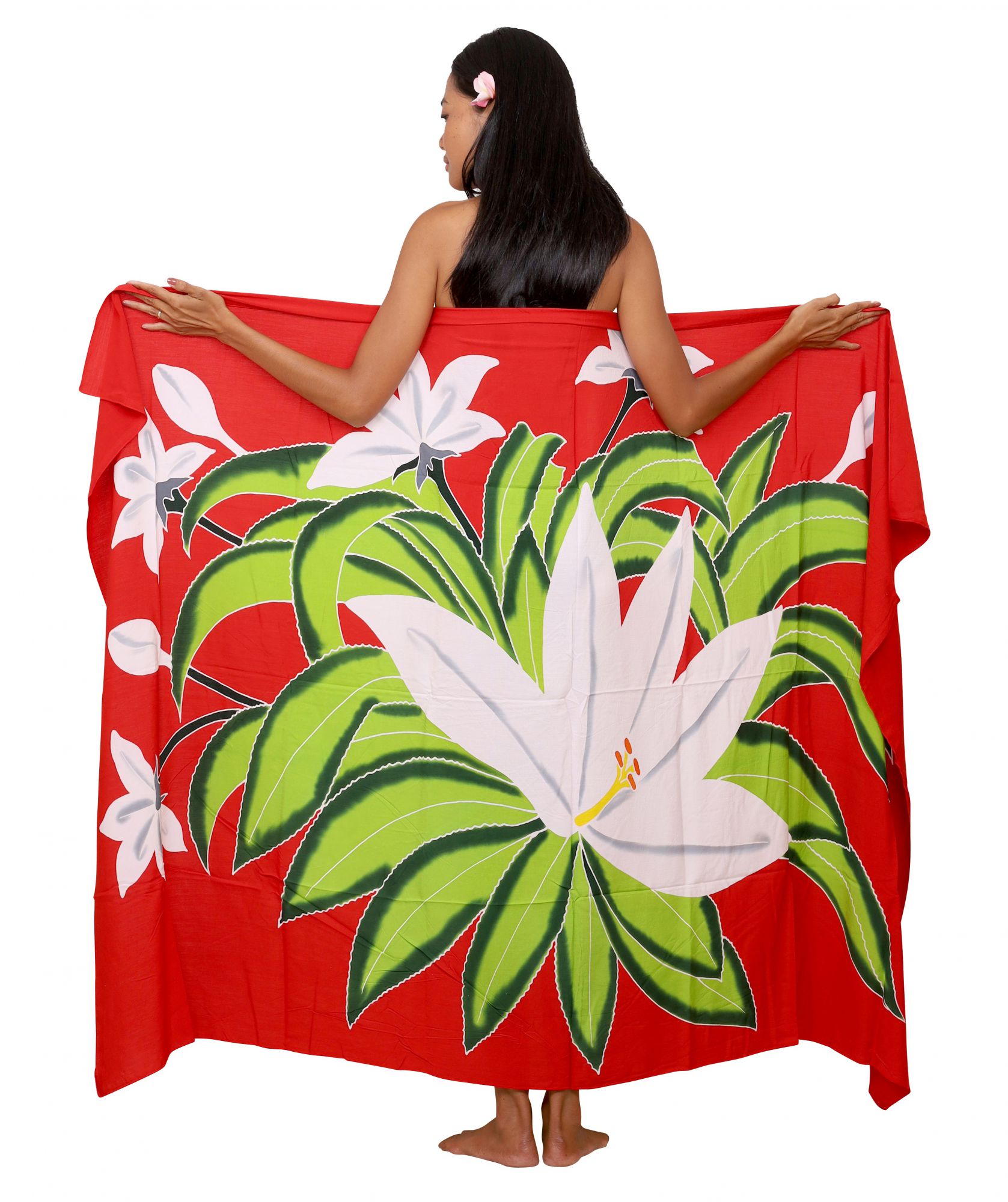 Accueil > Paréos > Paréo Tahiti peints à la main > Paréo bouquet Tiare Apetahi rouge