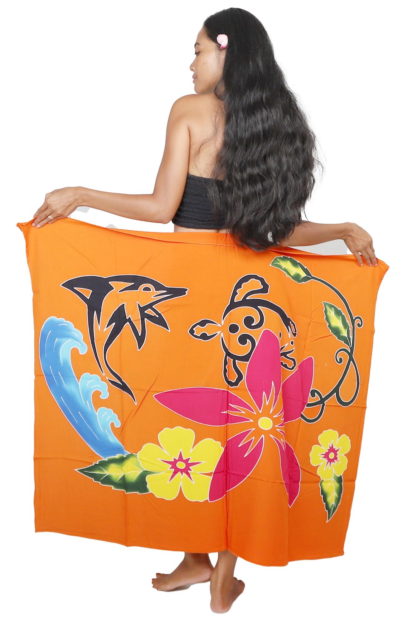 Le fond orange met en valeur trois motifs distincts : une fleur tropicale, une tortue marine et un dauphin. Cette composition graphique évoque l'univers polynésien et stimule l'imagination des plus jeunes. Les contrastes chromatiques facilitent l'identification des différents éléments décoratifs.