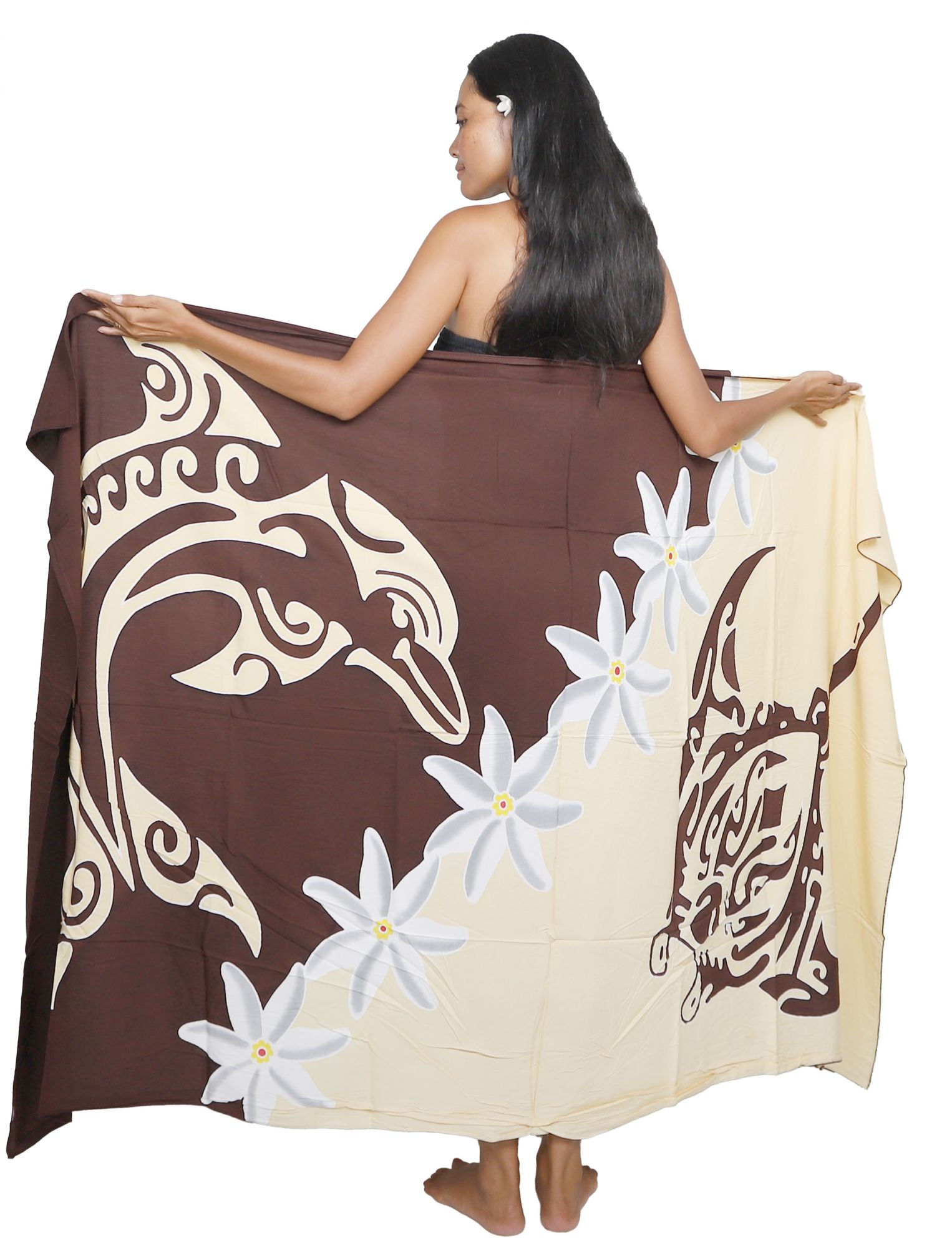 Avec ses couleurs beige et marron, ce paréo présente des motifs originaux de raies et dauphins, entourés de fleurs blanches à cœurs jaunes. Cette combinaison évoque un paysage marin apaisant, parfait pour un batik pour la plage.