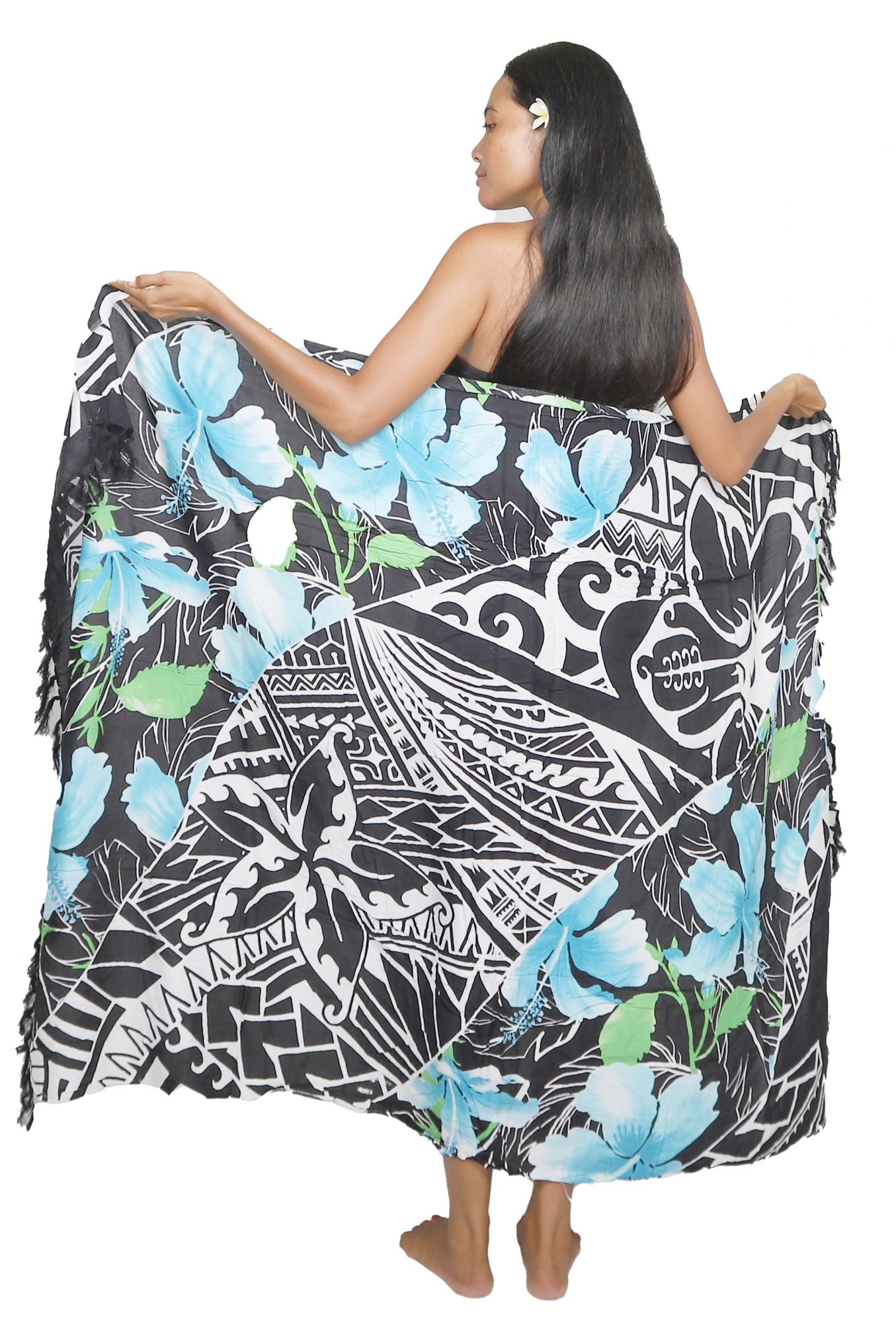 Ce paréo hibiscus bleu pour la plage présente un motif floral distinctif associé à des éléments tribaux blancs sur fond noir. Fabriqué à Bali selon les traditions artisanales locales, ce paréo tribal bleu pour femme combine authenticité et fonctionnalité.
