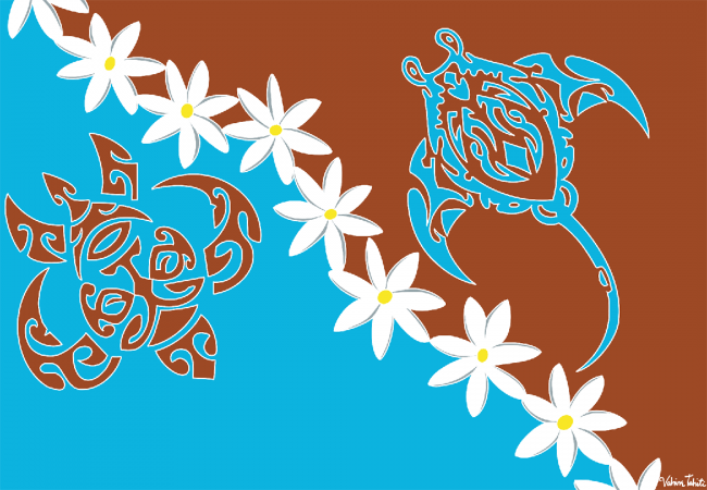Découvrez l'élégance océanique du paréo tahiti peint à la main "Paréo Lagon Tribal bleu et chocolat". Ce chef-d'œuvre artisanal, fabriqué à Bali, invite à voyager à travers ses 175 cm x 115 cm de motifs captivants, où deux tortues polynésiennes et une guirlande de fleurs de tiaré blanches dansent sur un fond bleu ciel et bleu marine.