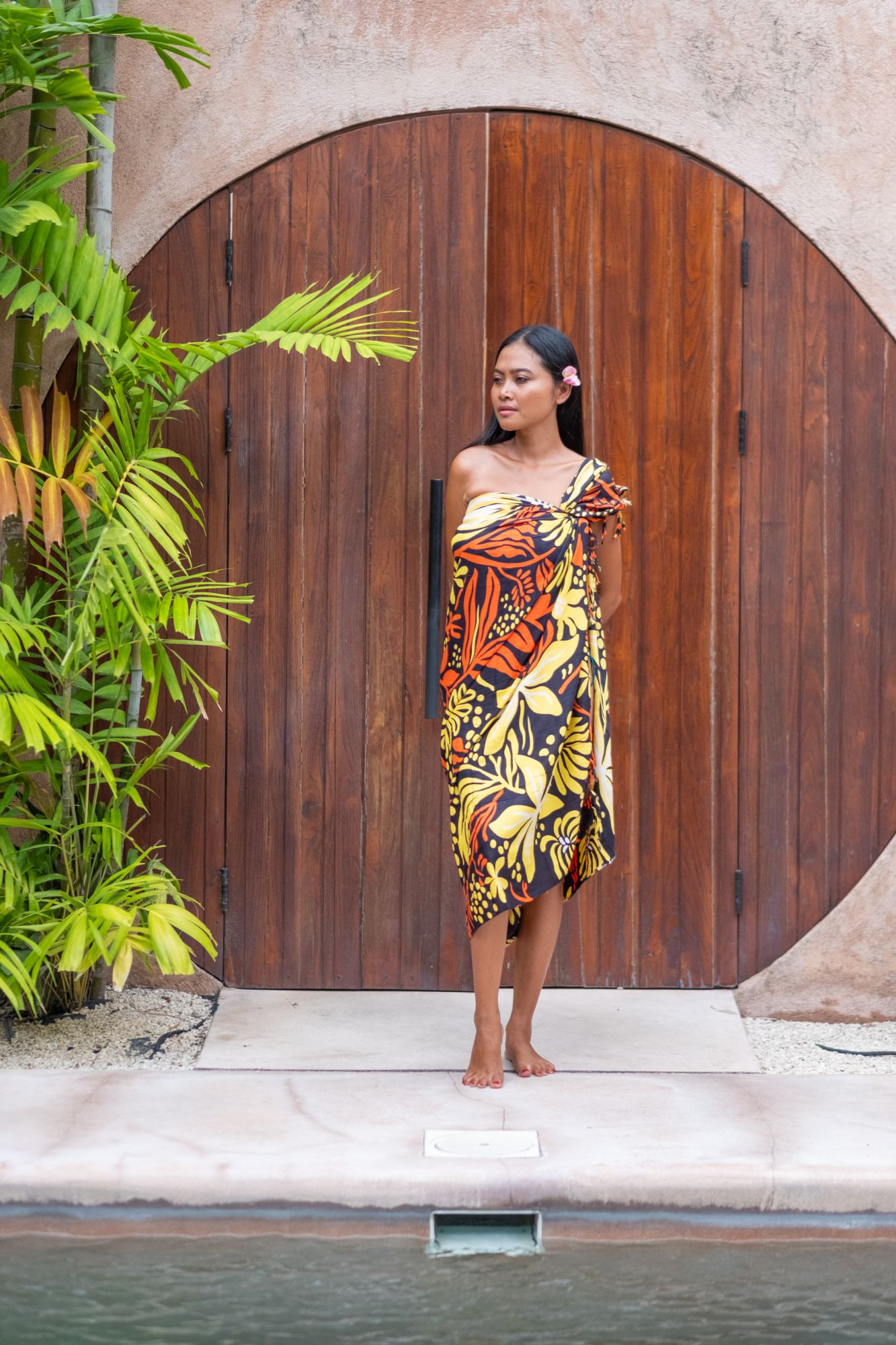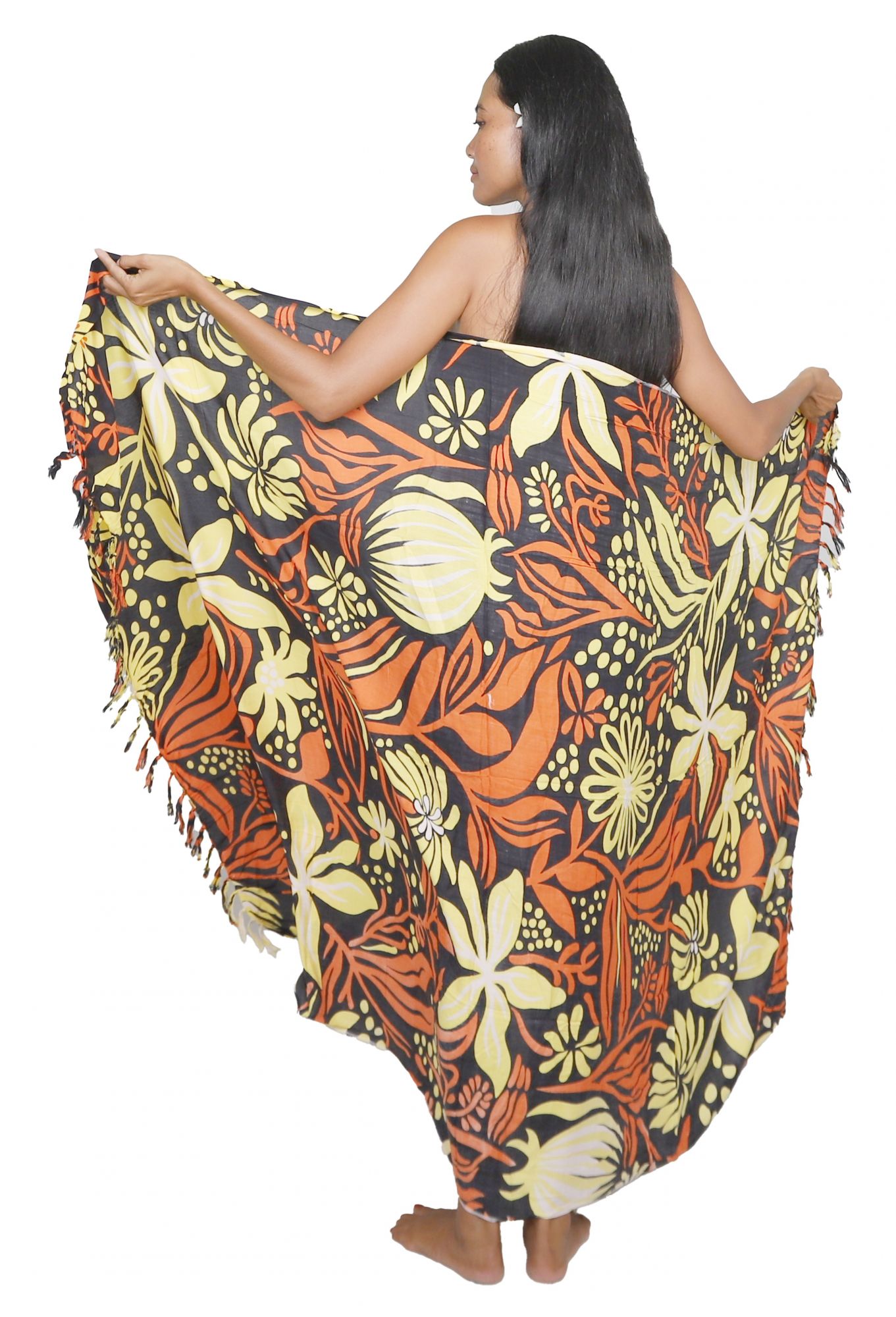 Ce paréo plage élégant pour femme associe harmonieusement le noir profond aux nuances d'orange et de jaune dans un design inspiré de la nature balinaise. Fabriqué artisanalement à Bali, ce paréo reflète l'authenticité et le savoir-faire traditionnel indonésien.