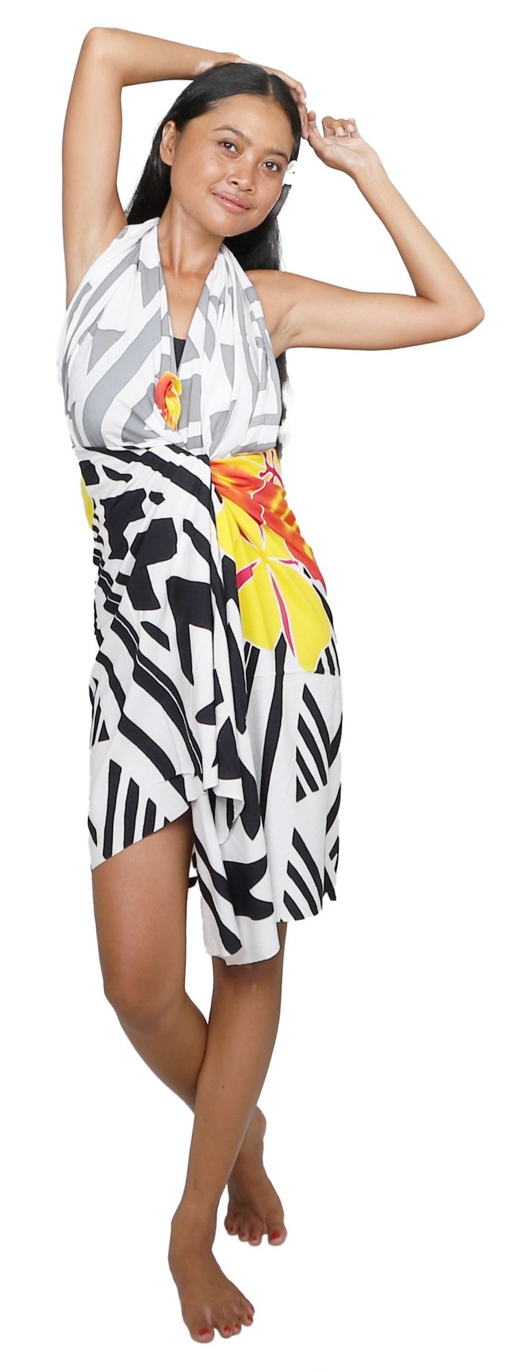 Laissez-vous séduire par sa polyvalence. À la plage, il remplace la serviette. En ville, il se transforme en robe ou châle. En voyage, sa légèreté ne surcharge pas vos bagages. Les motifs blancs et noirs donnent un aspect TRIBAL, une esthétique qui se marie avec une multitude de tenues.