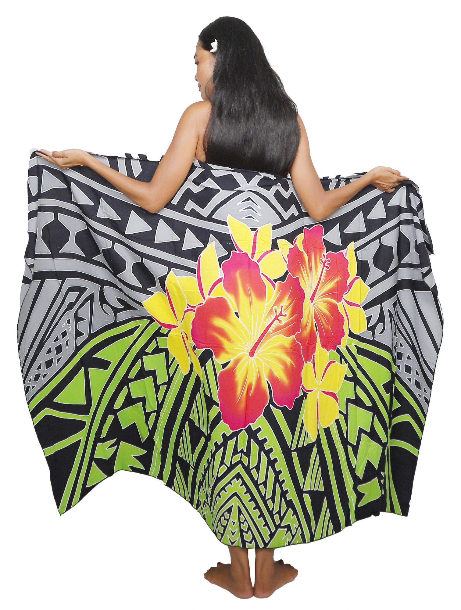 Ce paréo peint main aux motifs floraux révèle toute la richesse de l'artisanat balinais. Confectionné en viscose, ce paréo Tahiti pour femme mesure 175 cm x 115 cm et arbore des motifs polynésiens vert rehaussés de noir, avec des touches de jaune et rose au centre.