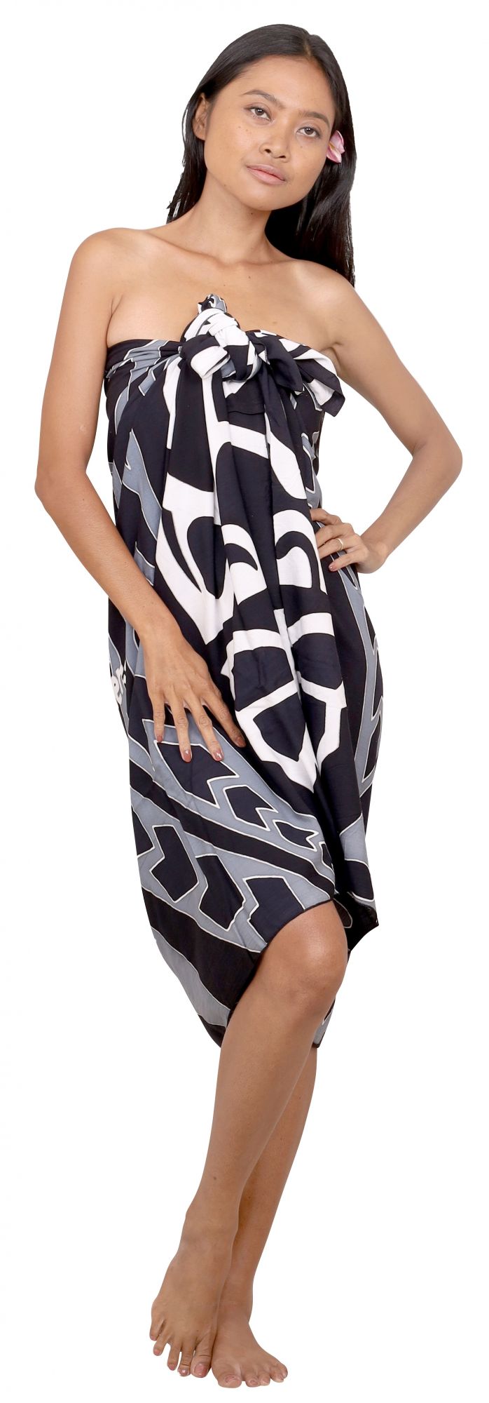 Les motifs géométriques et abstraits s'inspirent directement de l'art polynésien traditionnel. L'inscription "MAOHI L'âme des Guerriers" en lettres blanches contraste avec le fond noir, créant un effet visuel marquant. Cette esthétique paréo noir style polynésien convient parfaitement aux occasions décontractées.