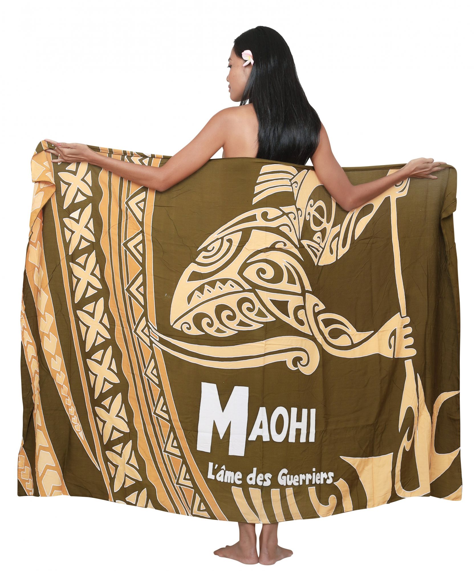 Le paréo peint main Maohi vert est un accessoire élégant, inspiré de l'art polynésien, conçu pour les occasions décontractées et les moments à la plage.