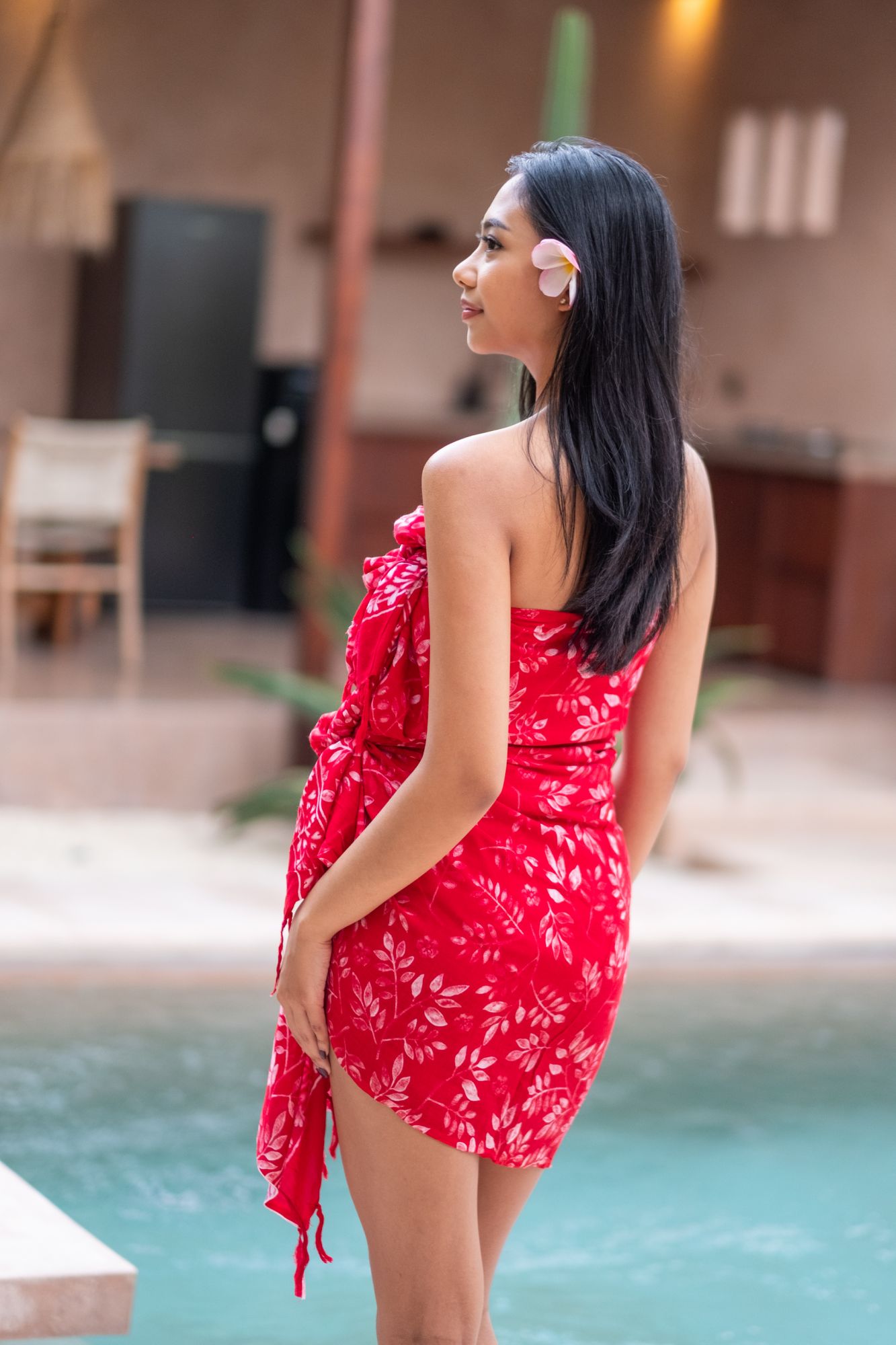 Ce paréo rouge à fleurs pour la plage est conçu en viscose, offrant une sensation de douceur et une légèreté incomparable. Avec ses dimensions de 175 cm x 115 cm, il couvre largement tout en permettant une aération optimale pour éviter les coups de soleil. La fabrication artisanale à Bali garantit une authenticité et un respect des traditions locales.