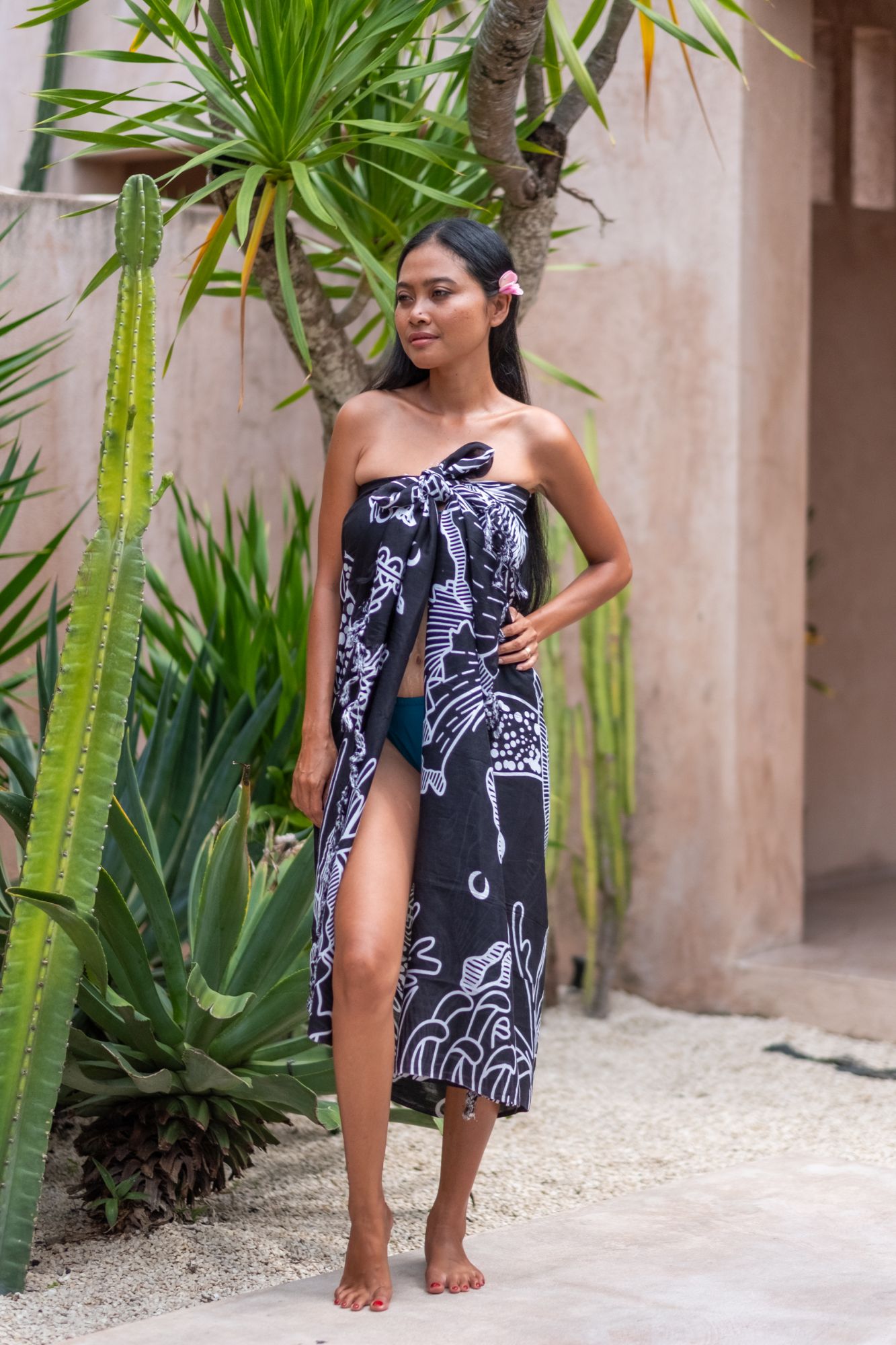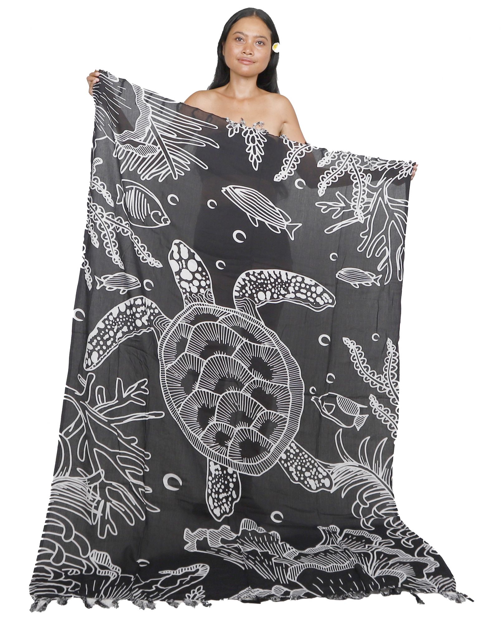 Ce grand paréo motif tortue noir associe l'artisanat balinais traditionnel à un design marin raffiné. Fabriqué en viscose douce, il offre une alternative confortable au coton classique avec ses 175 cm x 115 cm de dimensions généreuses.
