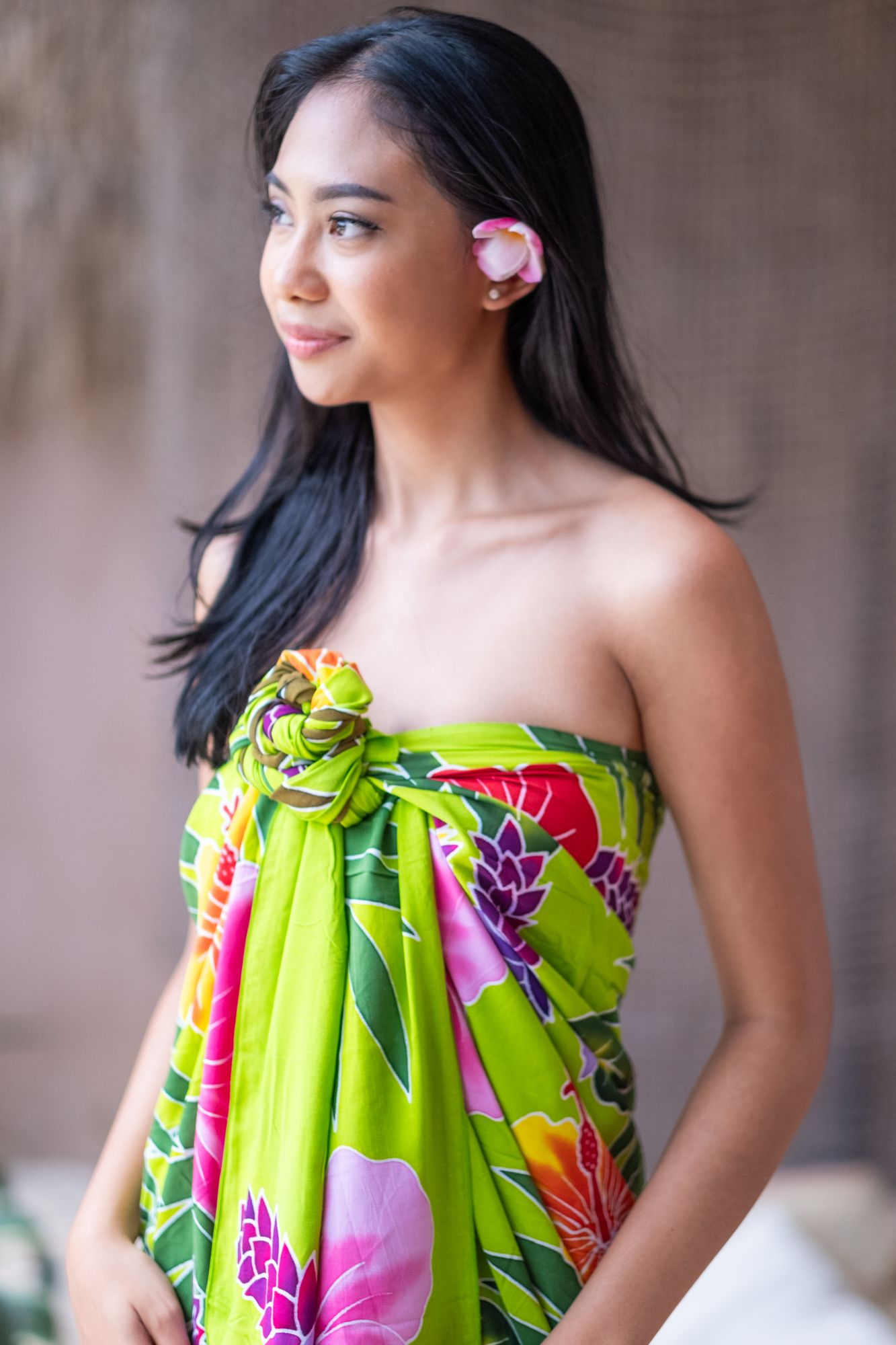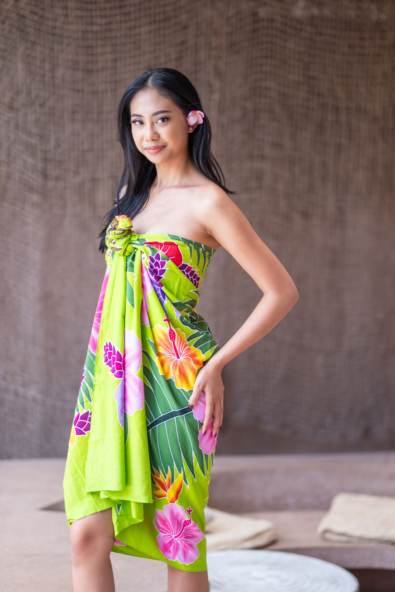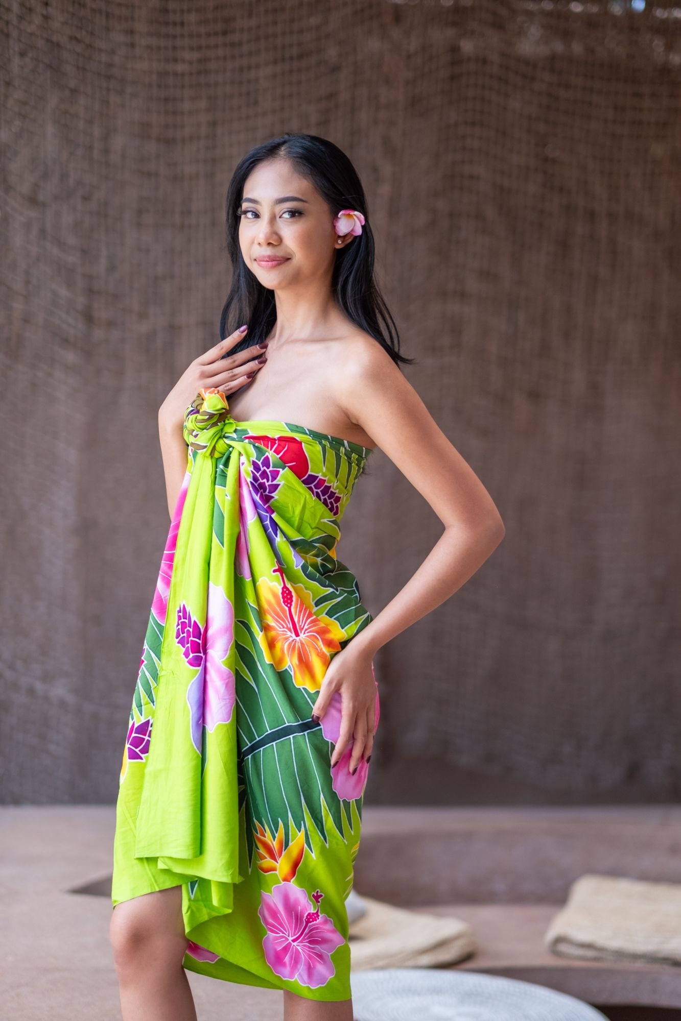 Ce paréo tahiti vert à fleurs transforme chaque sortie estivale en escapade tropicale. Confectionné à Bali selon les techniques artisanales traditionnelles, il arbore un motif floral vibrant aux tons rose, rouge, violet, orange et jaune sur fond vert immaculé.