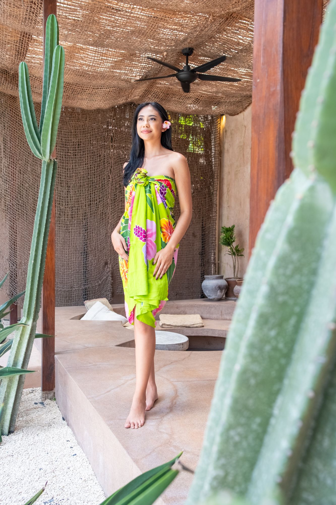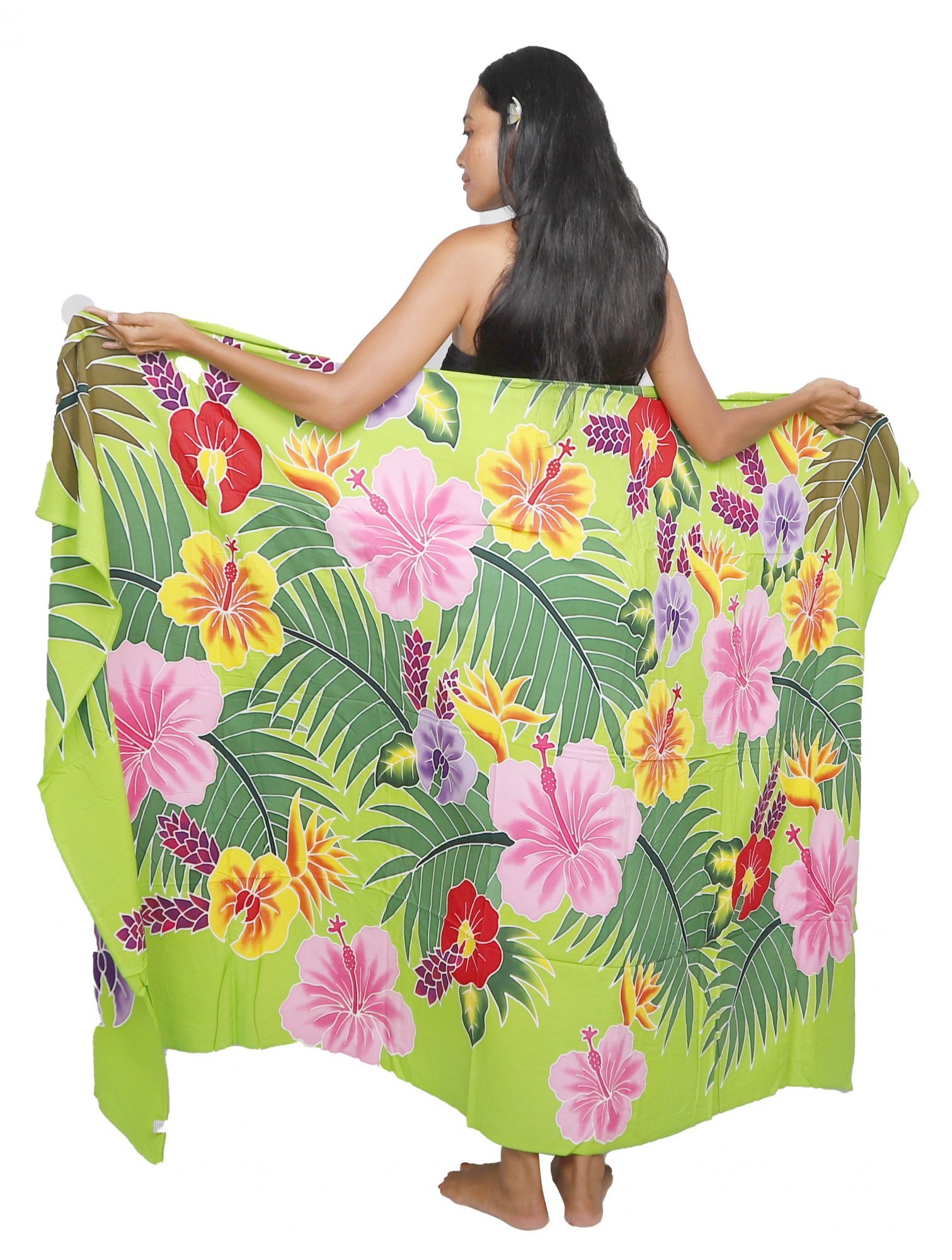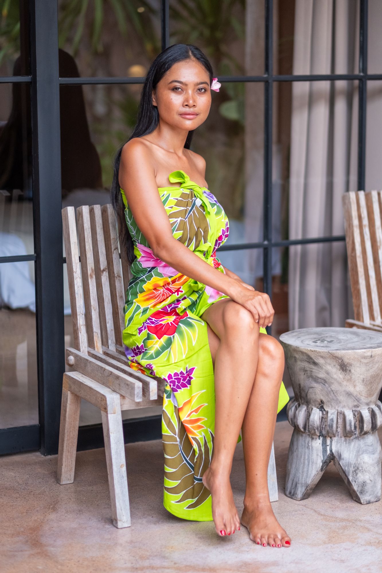 Ce paréo tahiti vert à fleurs transforme chaque sortie estivale en escapade tropicale. Confectionné à Bali selon les techniques artisanales traditionnelles, il arbore un motif floral vibrant aux tons rose, rouge, violet, orange et jaune sur fond vert immaculé.