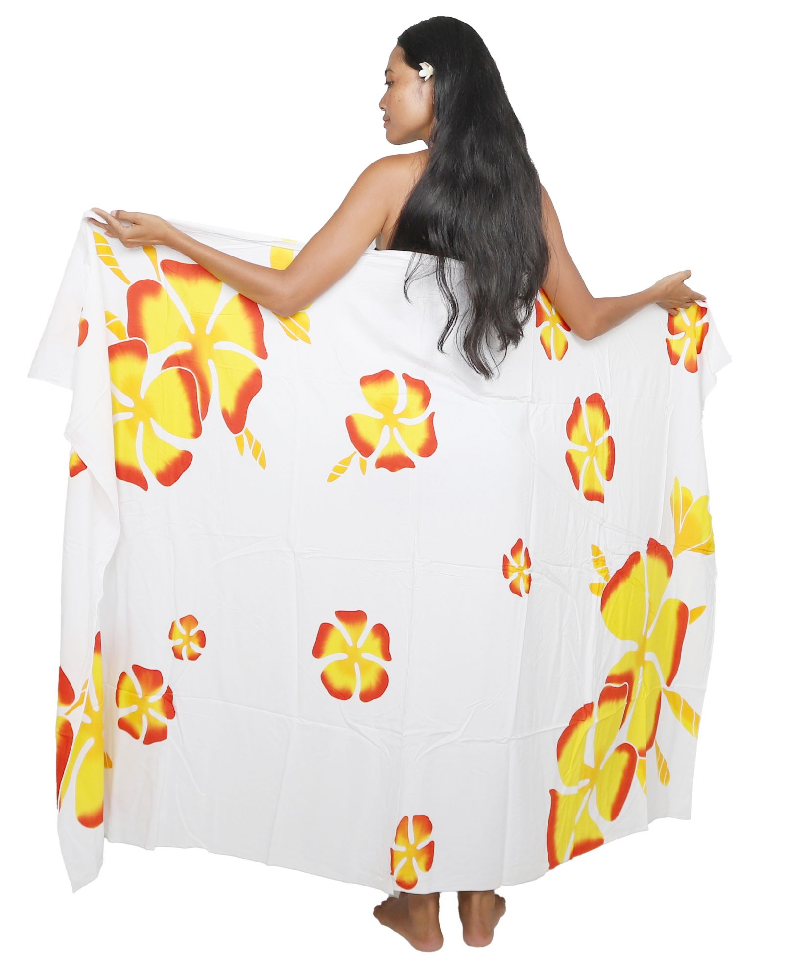 Ce paréo tahiti blanc peint main incarne l'art traditionnel balinais dans toute sa splendeur. Chaque pièce révèle un savoir-faire ancestral, où les motifs floraux jaunes et blancs prennent vie sur un fond blanc profond grâce à une technique de peinture manuelle minutieuse.