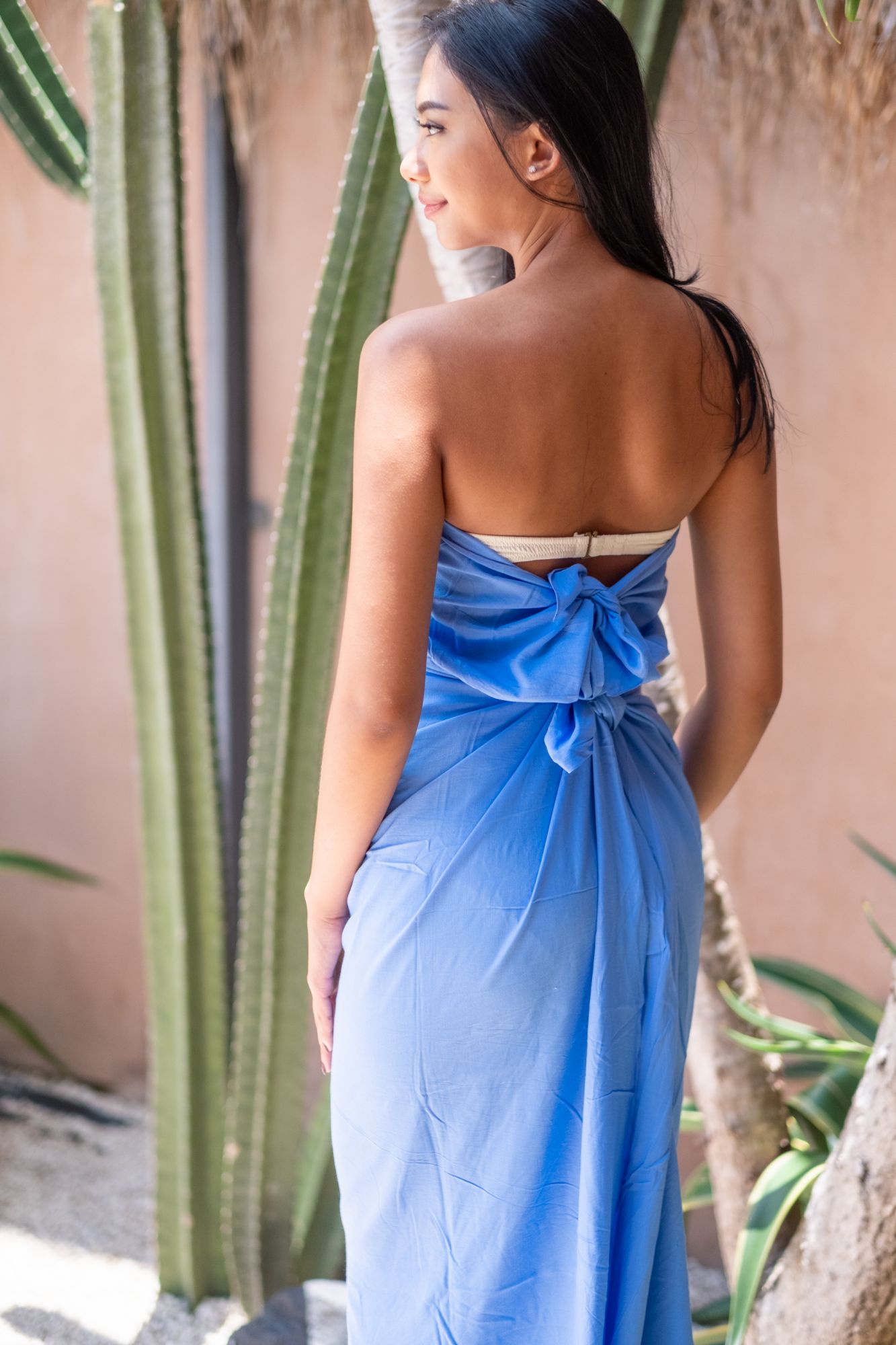 Ce paréo bleu uni peint à la main combine savoir-faire traditionnel balinais et modernité. Confectionné en viscose 100%, il offre une alternative plus douce au coton tout en conservant ses propriétés d'absorption et de respirabilité.