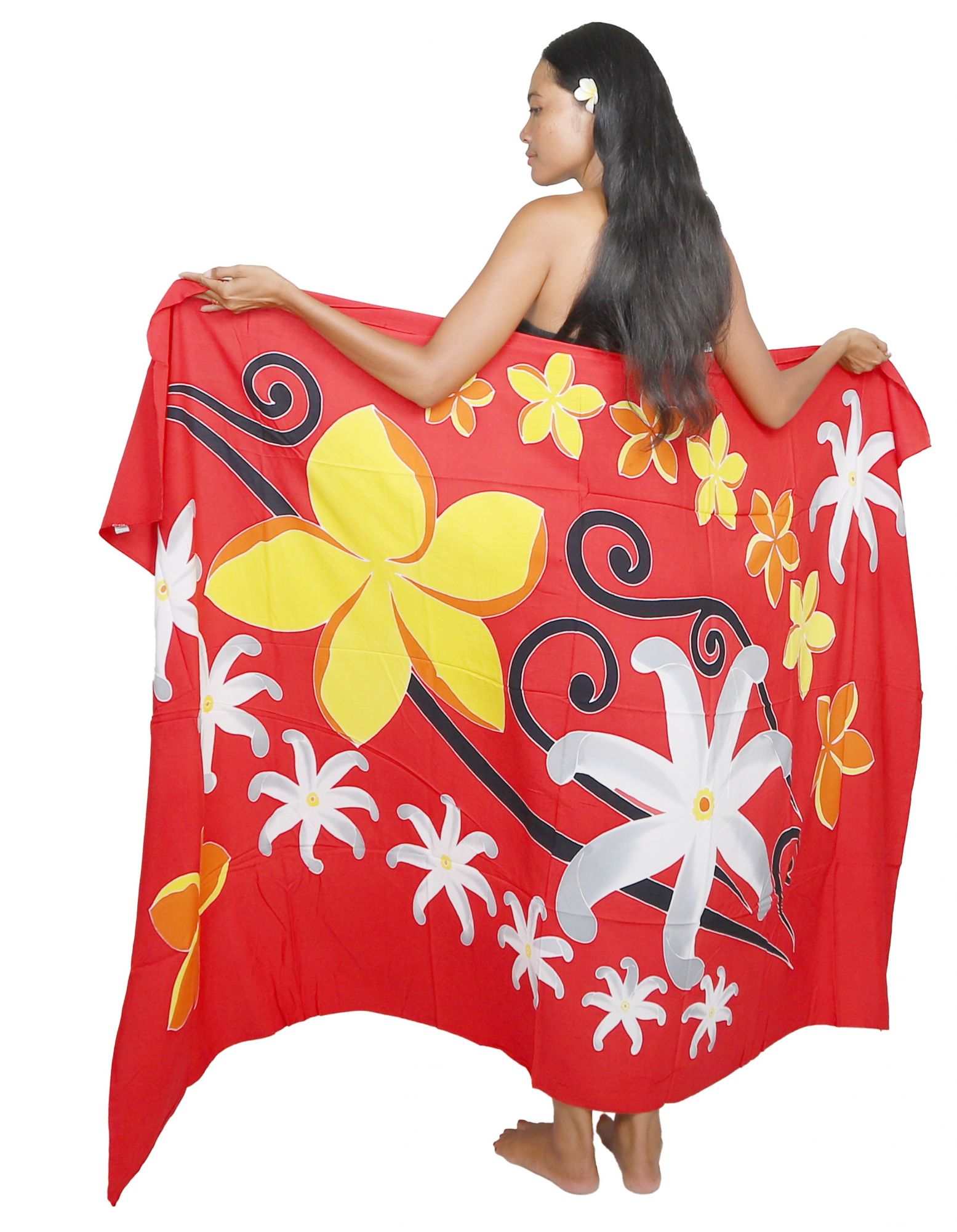 Ce paréo magnifiquement peint à la main arbore des motifs floraux vibrants, capturant l'essence des îles dans chaque détail. Les couleurs rouge vif, rehaussées de touches de jaune, orange et blanc, transforment votre look de plage en une œuvre d'art vivante.