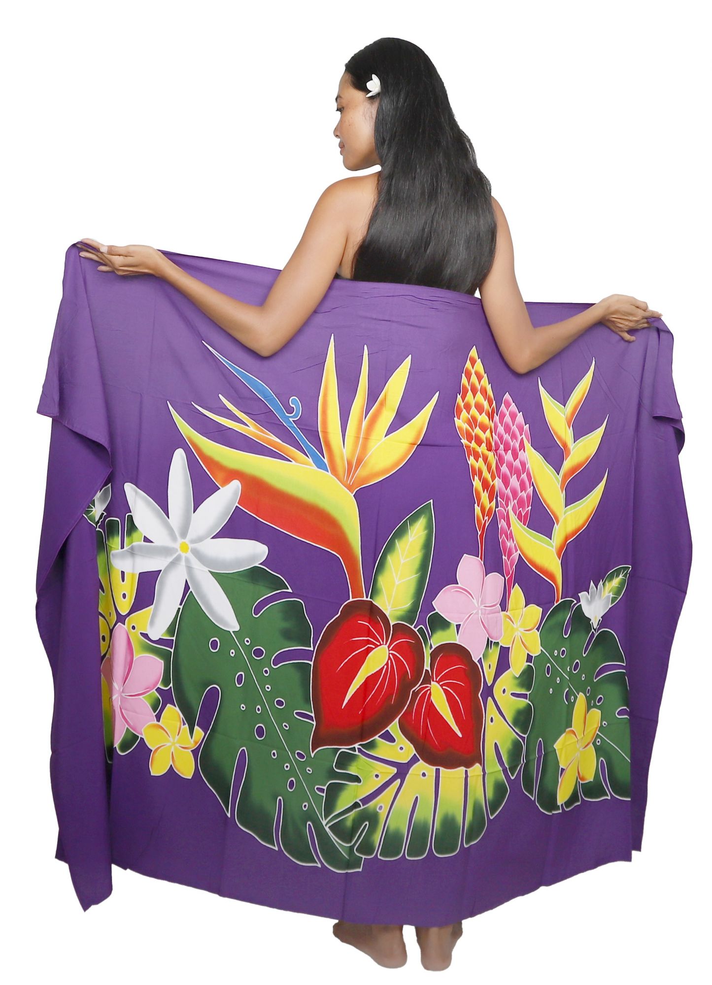 Ce paréo tahiti peint à la main présente un design rectangulaire aux dimensions généreuses de 175 cm x 115 cm. Sa confection artisanale à Bali garantit un savoir-faire traditionnel respectueux de l'environnement, tandis que sa couleur violet vibrante sublimée par des paréo motif floral inspiré de Tahiti apporte une touche d'exotisme authentique.