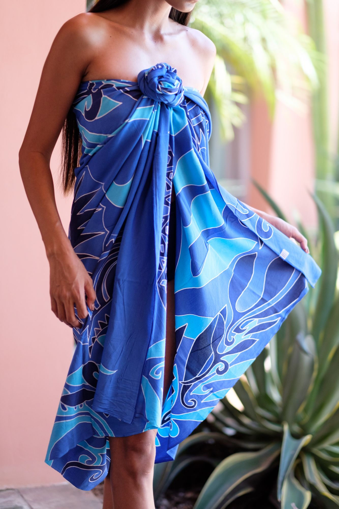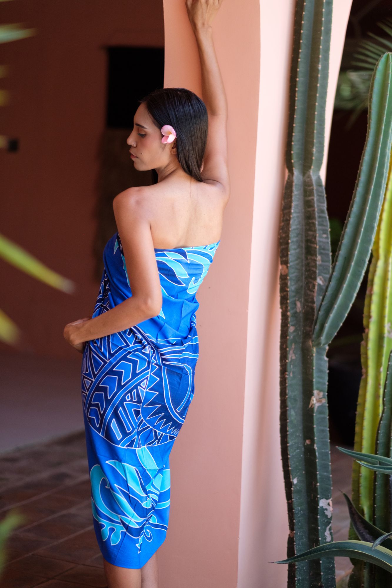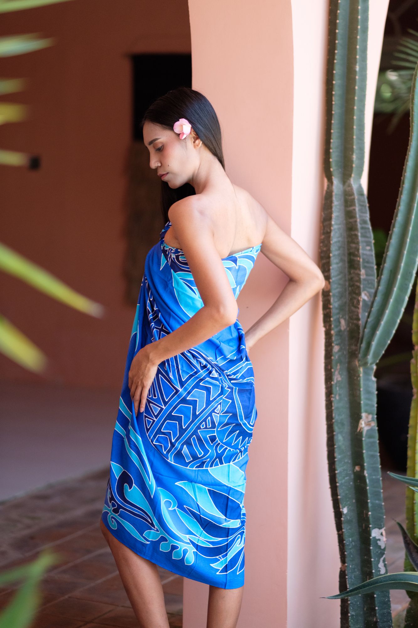 Ce paréo peint main d'inspiration Tahiti présente des motifs coquillage délicatement réalisés dans une harmonie de bleu ciel et marine. Chaque pièce résulte du travail minutieux d'artisans balinais qui perpétuent des techniques traditionnelles de peinture textile.
