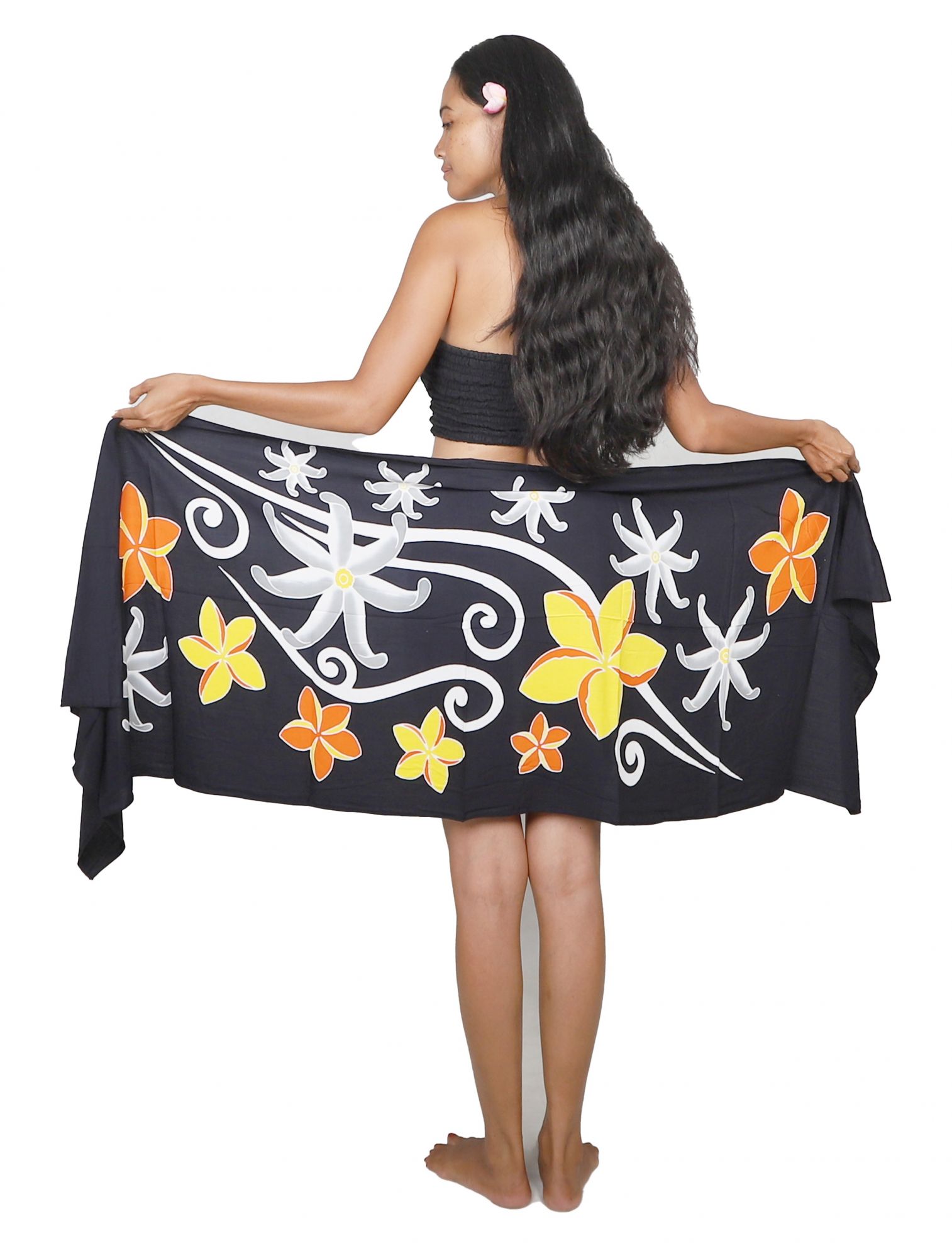 Ce paréo noir tendance présente des motifs floraux en blanc, jaune et orange, rehaussés de tourbillons noirs qui créent un ensemble harmonieux. Cette palette chromatique s'adapte parfaitement aux teintes estivales.