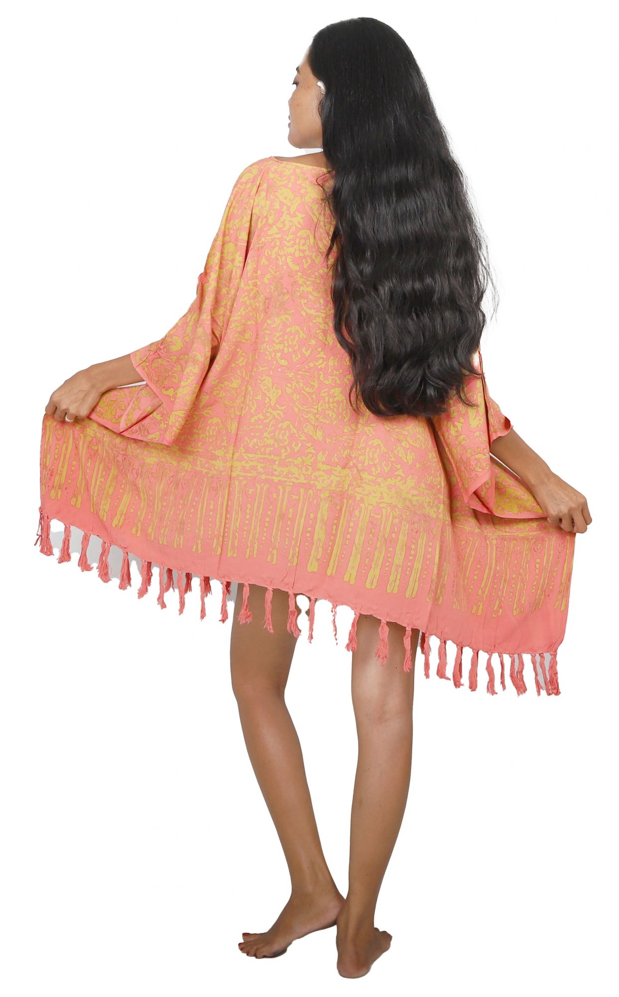 Le Poncho Batik Coucher de Soleil est une robe-paréo en viscose fabriquée à Bali, pensée pour couvrir le corps avec une coupe ample et une retombée fluide.