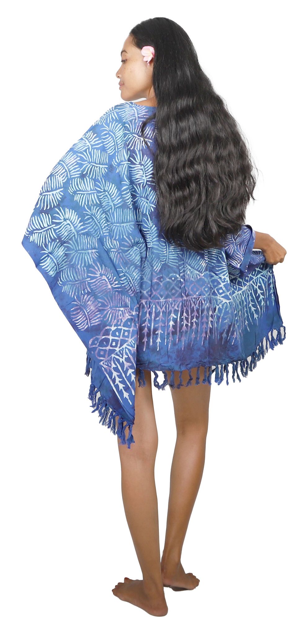 Ce poncho Palmes de Bali bleu combine savoir-faire traditionnel balinais et design contemporain. Confectionné artisanalement en viscose, il présente des motifs de palmes blanches sur fond bleu vif avec des détails géométriques délicats.