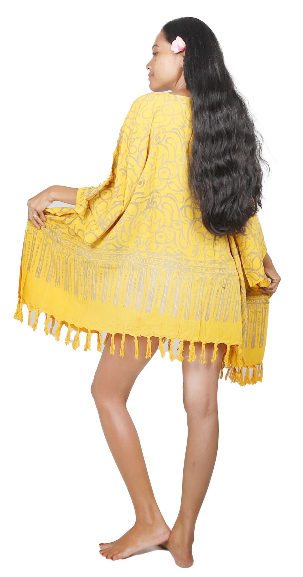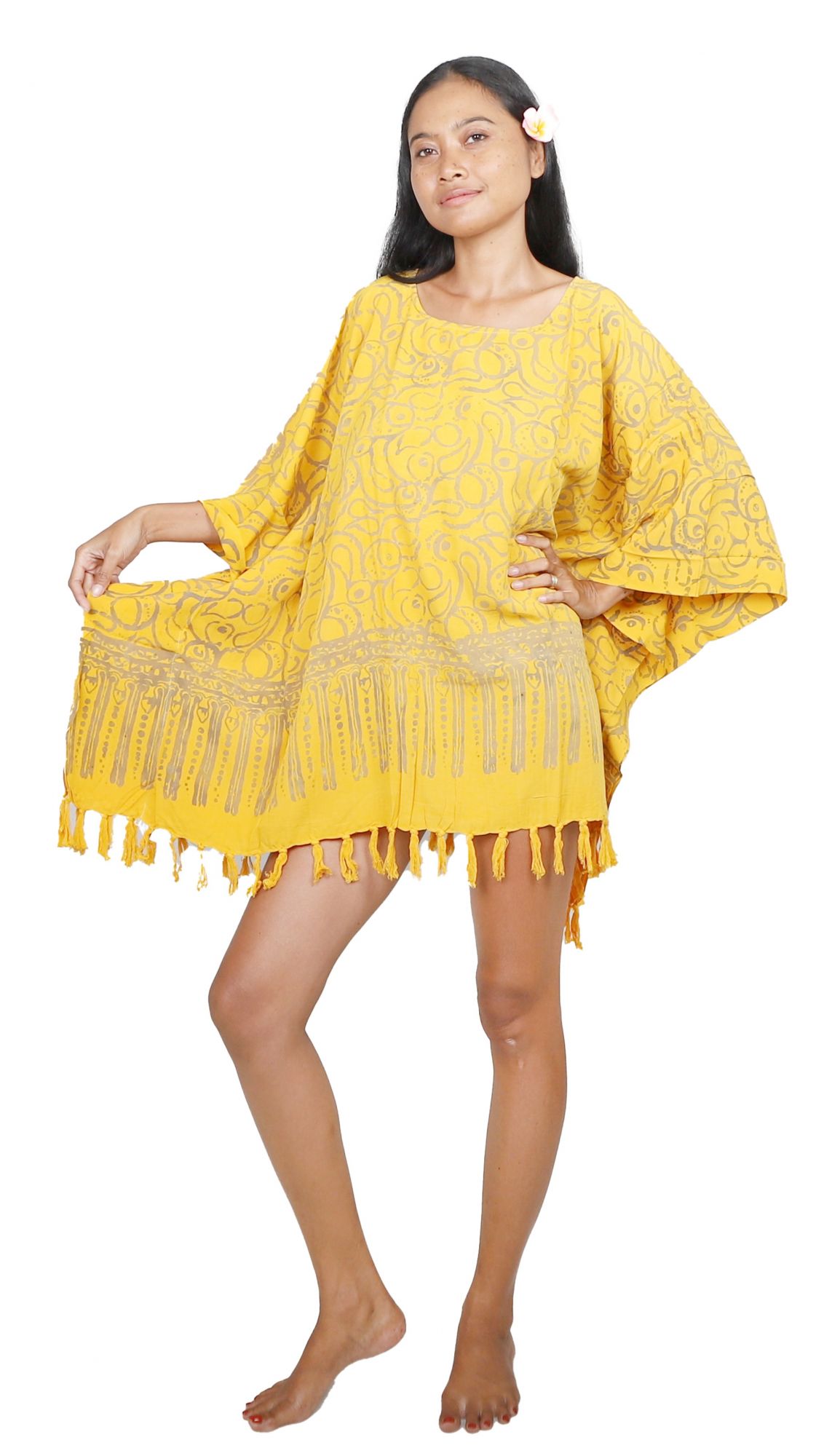Conçue comme une pièce estivale facile à enfiler, la Robe batik Ondes de Bali jaune associe une coupe poncho ample à un textile en viscose fabriqué à Bali.