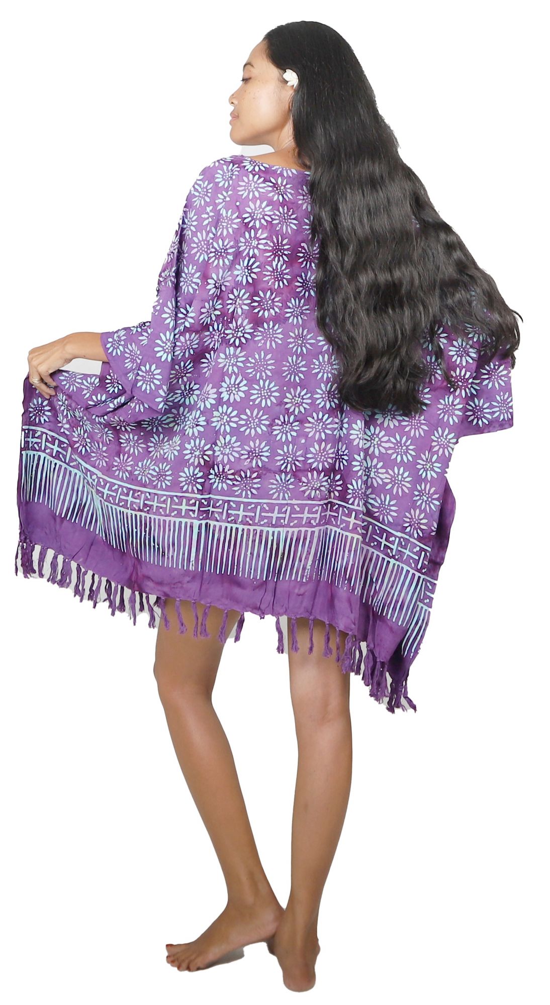 La viscose apporte une sensation souple, proche du coton, tout en restant légère et respirante. La largeur totale 105 cm laisse de l’aisance aux épaules et au buste, ce qui facilite l’enfilage et limite les marques lorsque vous passez d’une activité à l’autre. Les franges et la bande géométrique en bas donnent une ligne lisible, un peu comme un ourlet graphique qui stabilise visuellement la silhouette. Pour le référencement, cette pièce est parfois recherchée comme robe batik violet tropicale.