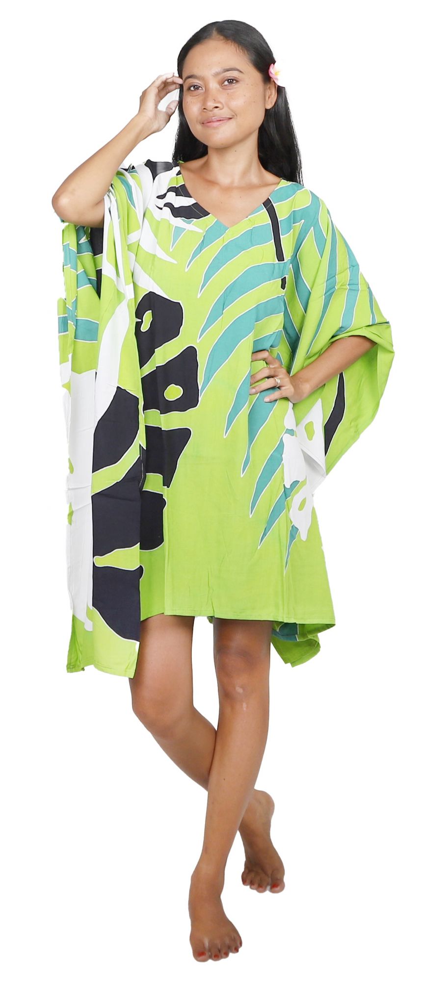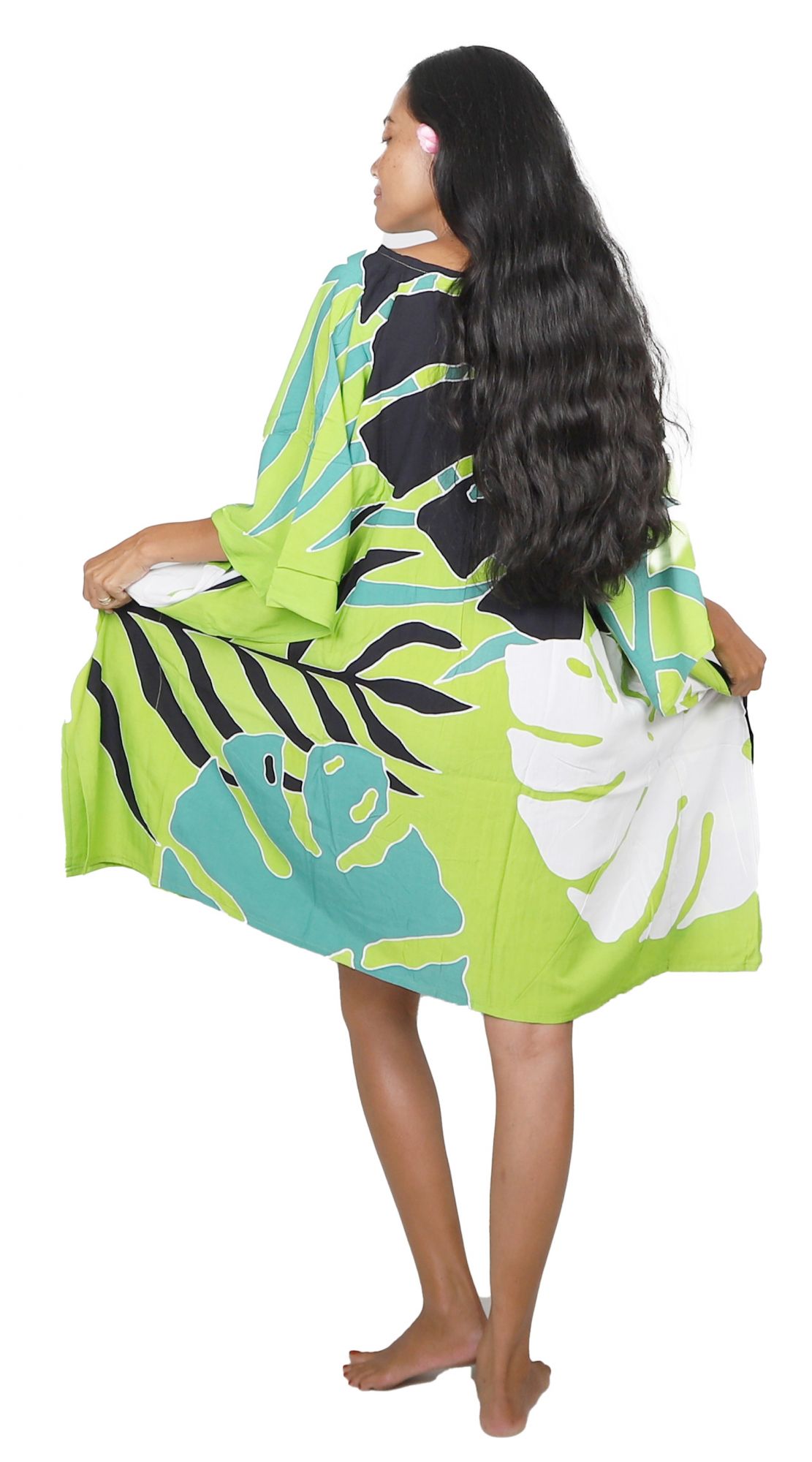 Cette robe paréo tahitienne verte présente des motifs de feuillage tropical réalisés entièrement à la main par des artisans balinais. Confectionnée en viscose, elle mesure 110 cm de largeur sur 190 cm de longueur et bénéficie d'un surfilage complet pour renforcer sa durabilité.