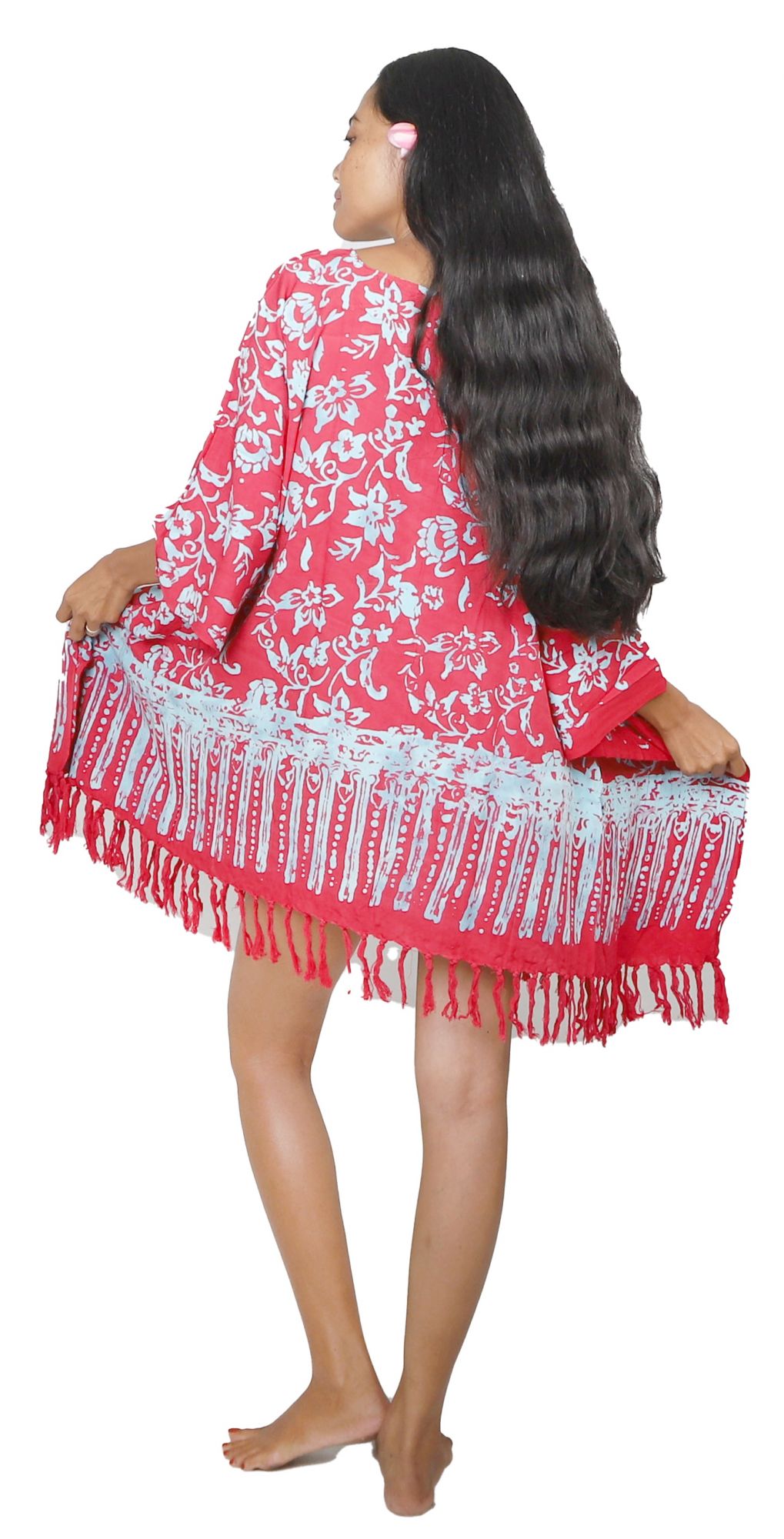 La Robe Paréo Vientiane rouge est une robe batik de Bali en taille unique, conçue pour s’enfiler par le haut comme un poncho, sans bouton ni fermeture.