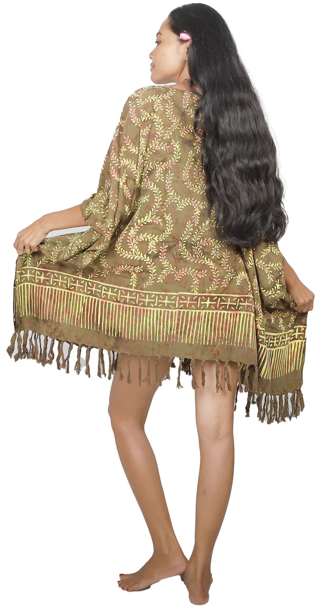 Cette tunique batik terre de bali est réalisée en viscose, une fibre appréciée pour son contact souple, tout en conservant une tenue agréable sur la peau. La coupe type poncho, en taille unique, facilite l’enfilage et laisse de l’aisance, y compris par temps chaud. Le textile est annoncé sans transparence, ce qui simplifie l’usage au bord de mer comme en tenue d’intérieur. La finition frangée en bas joue un rôle pratique : elle apporte du mouvement au vêtement, un peu comme une serviette légère qui ne reste pas figée. Fabriquée à Bali, elle s’inscrit dans une logique d’artisanat local, en cohérence avec les engagements du Comptoir du Paréo.